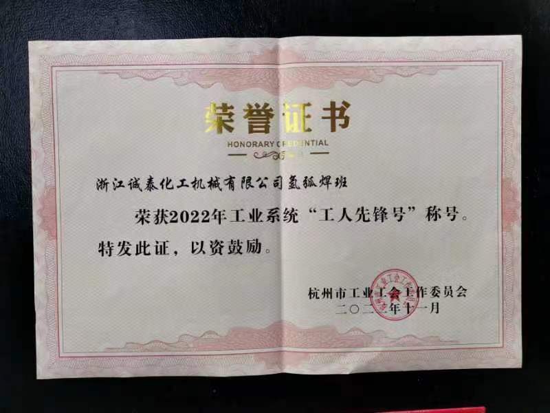 祝賀我公司“一種用于連續(xù)生產(chǎn)的余熱回收綜合裝置研發(fā)”獲得2022年度杭州市工業(yè)工會“五小”成果三等獎; 公司氬弧焊班組獲得2022年度杭州市工業(yè)工會“工人先鋒號”稱號。
