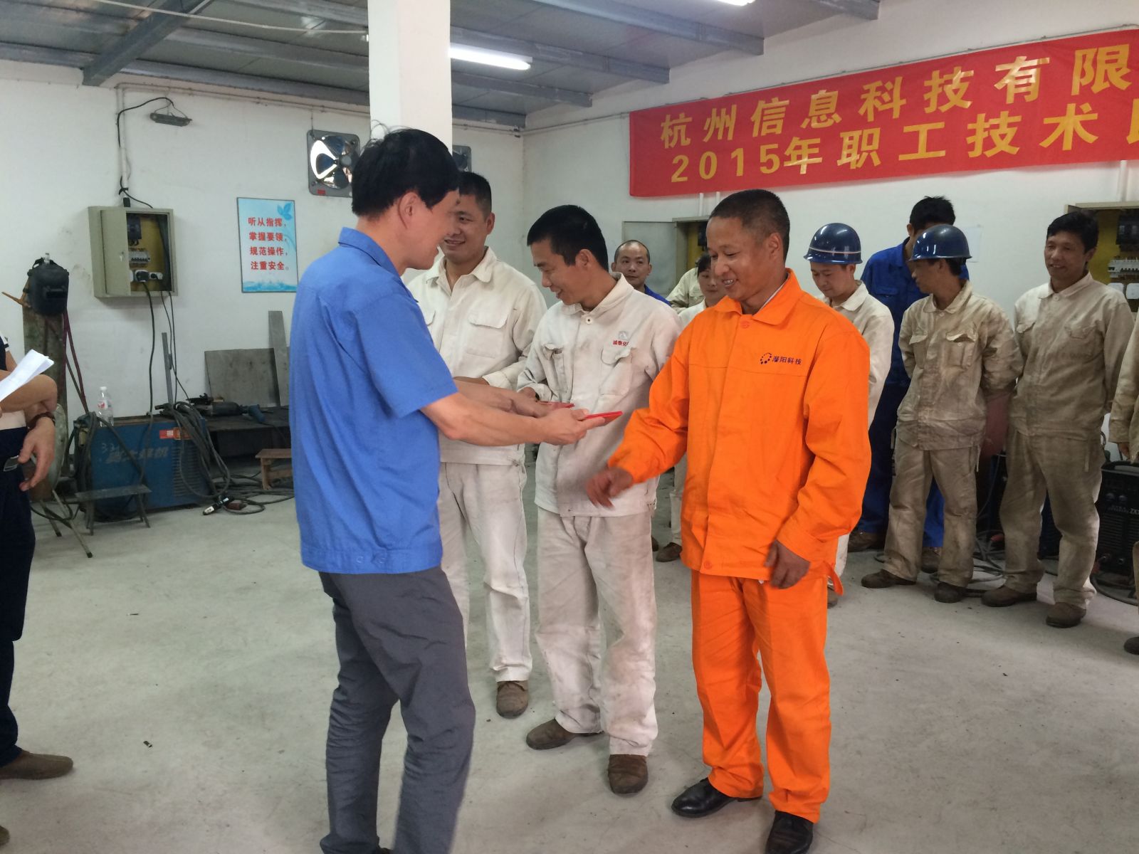 為了激發(fā)全體員工學(xué)習(xí)知識(shí)、技術(shù)的積極主動(dòng)性,形成奮發(fā)向上、爭(zhēng)創(chuàng)一流的氛圍,我公司與杭州信息科技有限公司于2015年9月28日聯(lián)合舉辦了一次電焊技能交流大賽。公司技術(shù)人員積極參與了比賽,并使出自己的真本事取得了優(yōu)異的成績(jī),展現(xiàn)了誠(chéng)泰人的風(fēng)采。公司董事長(zhǎng)親臨現(xiàn)場(chǎng)為獲獎(jiǎng)?wù)哳C發(fā)獲獎(jiǎng)證書(shū),并鼓勵(lì)各技術(shù)人員再接再厲,勇創(chuàng)佳績(jī)。